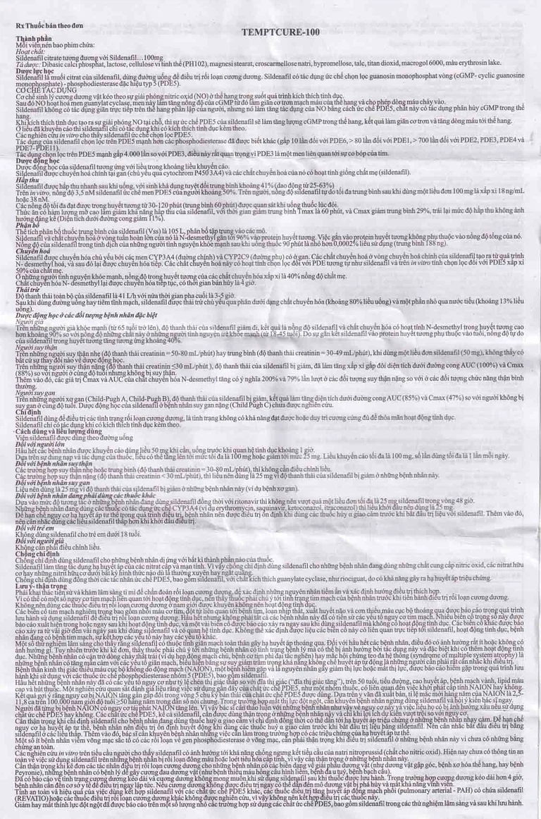 TEMPTCURE-100 chứa sildenafil dưới dạng muối citrat, dùng đường uống để điều trị rối loạn cương dương. Sildenafil có tác dụng ức chế chọn lọc guanosin monophosphat vòng (cGMP- cyclic guanosine monophosphate) – phosphodiesterase đặc hiệu túyp 5 (PDE5).