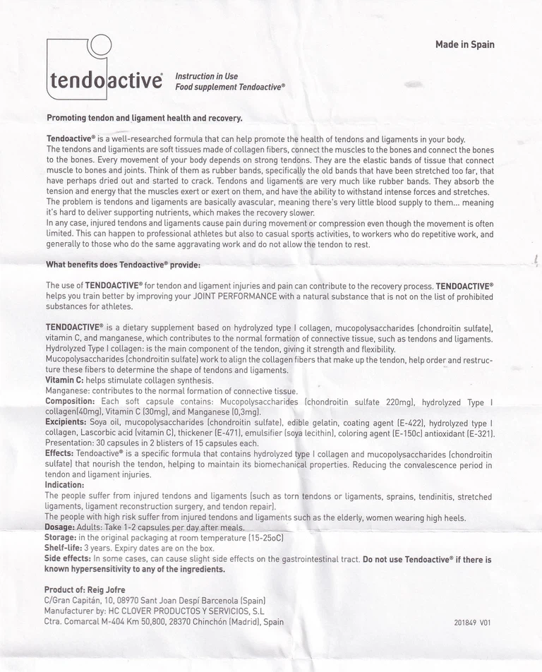 Tendoactive với thành phần chính là collagen type I quyết định đến độ bền, dẻo dai, đàn hôi của dây chằng bên trong và bên ngoài được bổ sung nhằm chống lại quá trình lão hóa, mang đến độ dẻo dai – bền bỉ nâng cao sức mạnh của gân và dây chằng. Ngoài ra, vitamin C và mucopolysaccharide có trong Tendoactive giúp lặp lại trình tự cấu trúc các sợi collagen và có chức năng chống viêm, hỗ trợ tăng cường sức khỏe của gân và dây chằng.