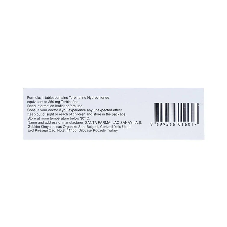 Terbisil 250mg Tablet là sản phẩm của Công ty Santa Farma Ilac Sanayii A.S., có thành phần chính là terbinafine. Thuốc được dùng để điều trị các bệnh lý nhiễm nấm như: Nấm da đầu, nấm toàn thân, nấm chân, nấm móng…Terbisil 250mg Tablet được bào chế dạng viên nén hai mặt lồi, hình tròn, màu trắng hoặc gần trắng với một mặt khắc vạch chia và “250” được khắc trên mặt kia, viên có thể bẻ đôi. Thuốc đóng gói theo quy cách hộp 4 vỉ x 7 viên.