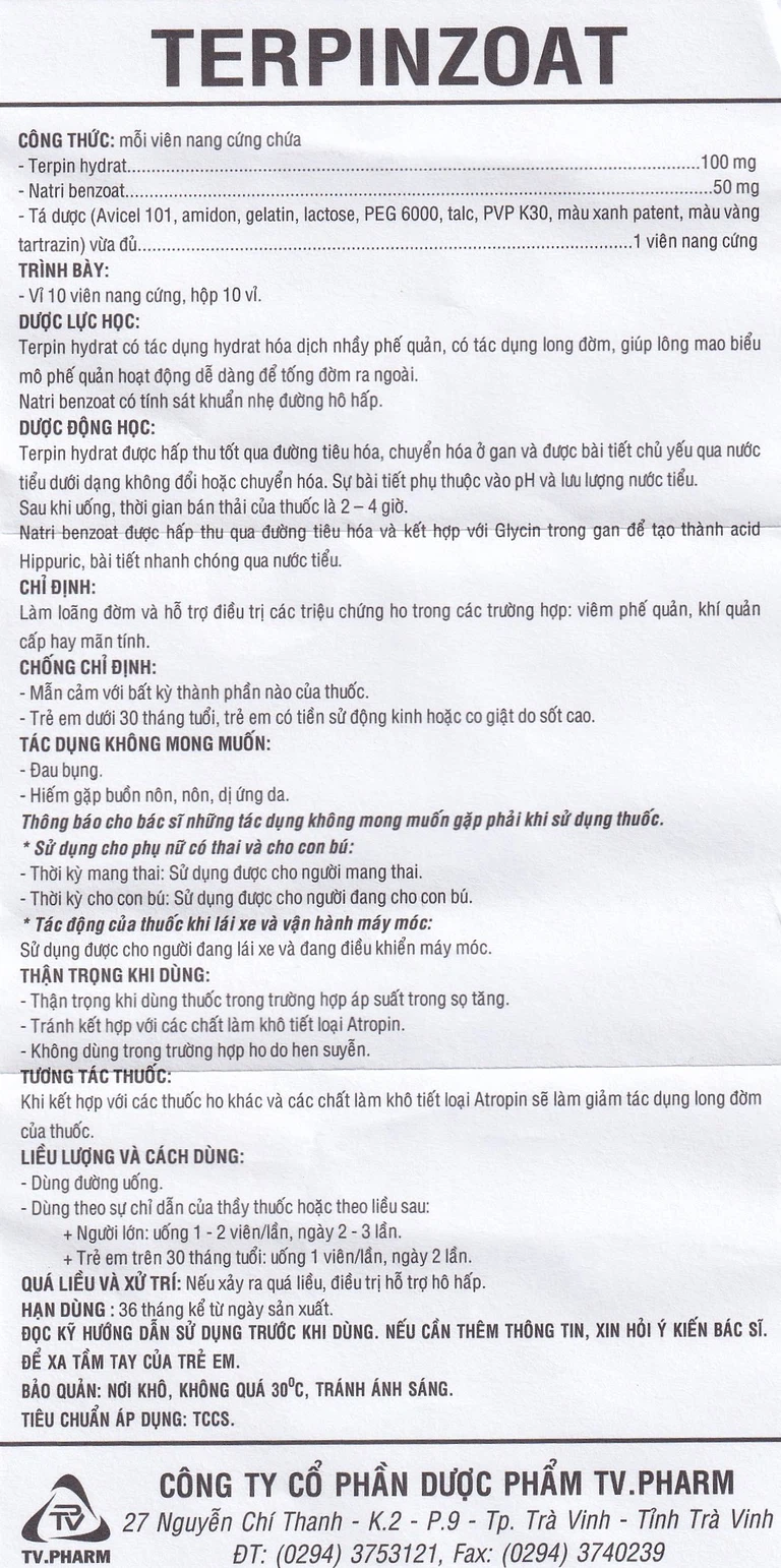 Terpin hydrat có tác dụng hydrat hóa dịch nhầy phế quản, có tác dụng long đờm, giúp lông mao biểu mô phế quản hoạt động dễ dàng để tống đờm ra ngoài. Natri benzoat có tính sát khuẩn nhẹ đường hô hấp.