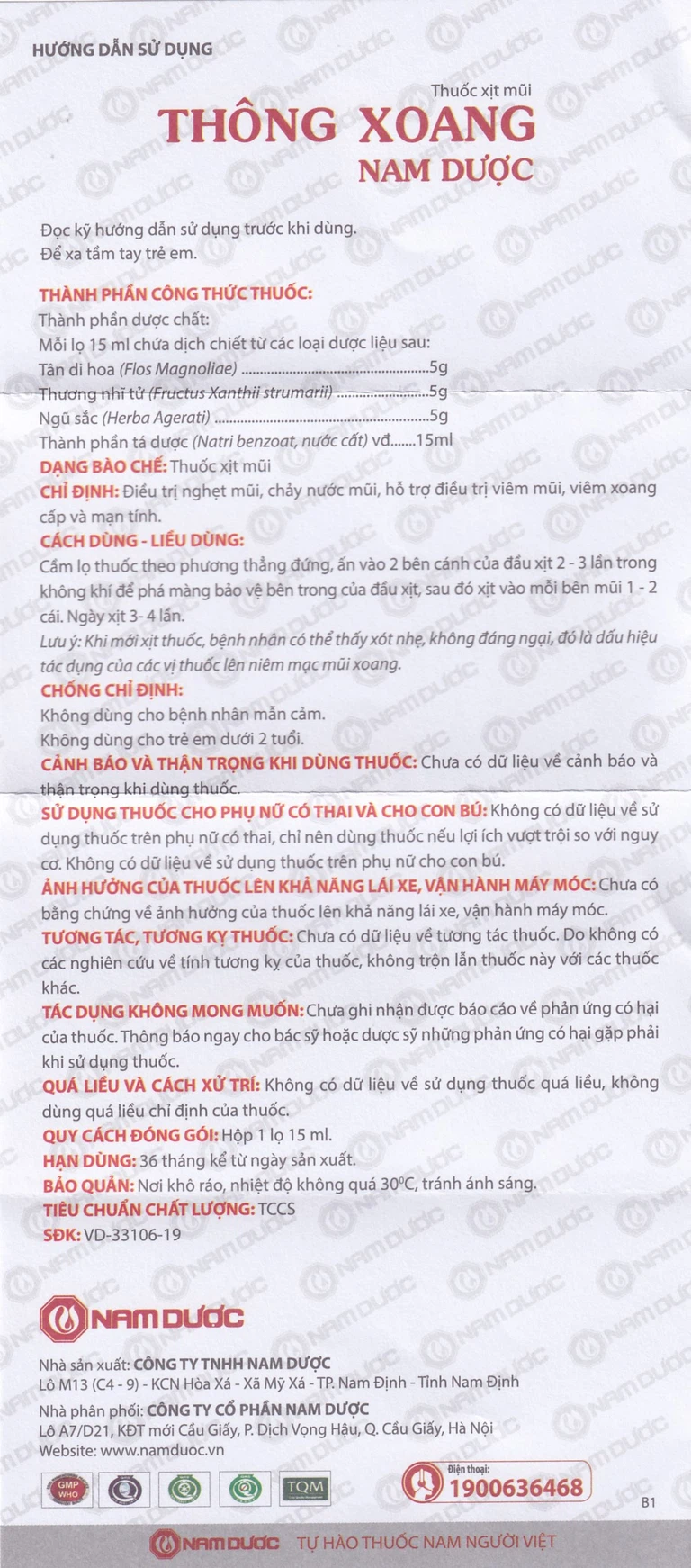 Thành phần của Thuốc xịt mũi Thông Xoang Nam Dược