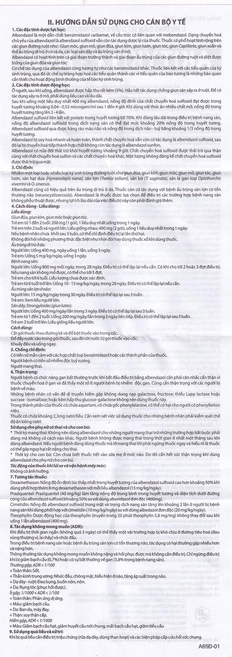 Albendazol có hoạt tính trên cả giai đoạn trưởng thành và giai đoạn ấu trùng của các giun đường ruột và diệt được trứng của giun đũa và giun tóc.