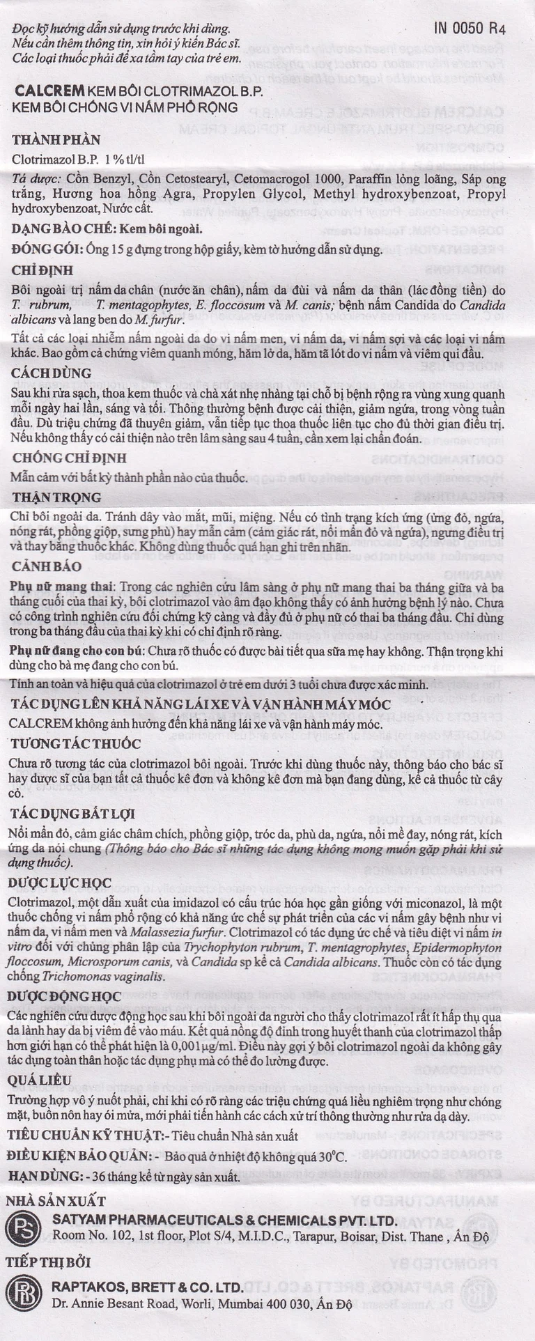 Calcrem được sản xuất bởi Satyam Pharmaceuticals & Chemicals Pvt. Ltd., với thành phần chính Clotrimazole, là thuốc dùng để bôi ngoài trị nấm da chân (nước ăn chân), nấm da đùi và nấm da thân (lác đồng tiền) do T. rubrum, T. mentagophytes, E. floccosum và M. canis; bệnh nấm Candida do Candida albicans và lang ben do M. furfur. Thuốc còn được dùng để điều trị tất cả các loại nhiễm nấm ngoài da do vi nấm men, vi nấm da, vi nấm sợi và các loại vi nấm khác, bao gồm cả chứng viêm quanh móng, hăm lở da, hăm tã lót do vi nấm và viêm qui đầu.