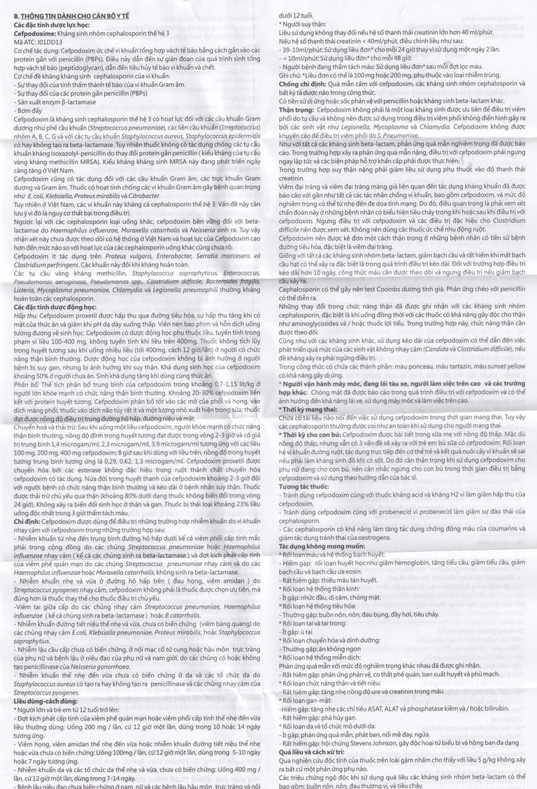 Viên nén bao phim và hỗn dịch uống tương đương về sinh học. Cefpodoxim có dược động học phụ thuộc liều, tuyến tính trong phạm vi liều 100-400 mg, không tuyến tính khi liều trên 400mg.