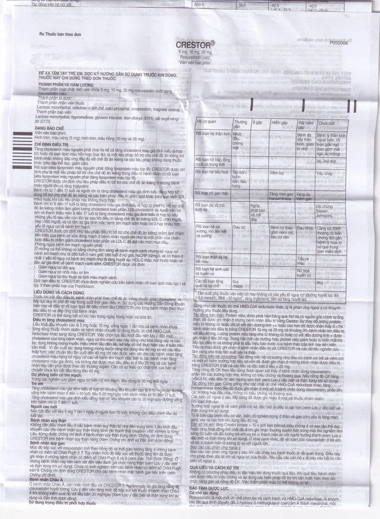 Ảnh hưởng trên cơ xương:Các tác dụng trên cơ xương như đau cơ, bệnh cơ và hiếm hơn là tiêu cơ vân đã được báo cáo ở những bệnh nhân được điều trị bằng Crestor với tất cả các liều và đặc biệt với liều > 20 mg.