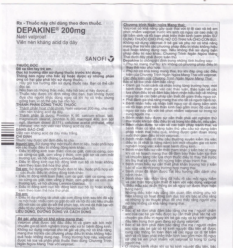 Không sử dụng Depakine 200mg ở bé gái, trẻ vị thành niên nữ, phụ nữ trong độ tuổi sinh sản và phụ nữ có thai nếu không thật sự cần thiết (nghĩa là, khi mà các biện pháp điều trị khác không hiệu quả hoặc bệnh nhân không dung nạp). Việc đánh giá này phải được thực hiện trước khi kê toa lần đầu tiên với Depakine 200mg hoặc khi người phụ nữ độ tuổi sinh sản có tiềm năng điều trị với Depakine 200mg có kế hoạch mang thai. Phụ nữ trong độ tuổi sinh sản cần phải sử dụng các biện pháp tránh thai có hiệu quả trong suốt quá trình điều trị.