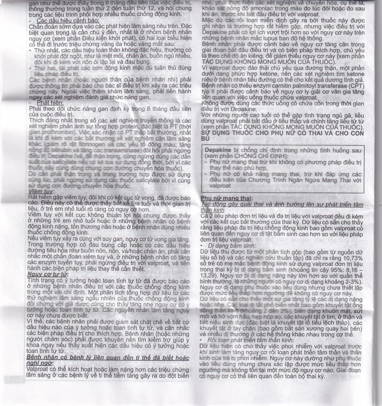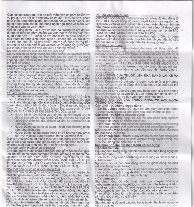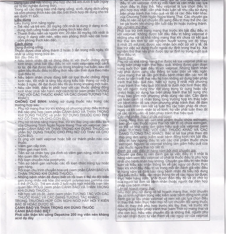 Depakine 200mg cần được khởi đầu điều trị và giám sát chặt chẽ bởi bác sĩ có kinh nghiệm trong điều trị động kinh hoặc rối loạn lưỡng cực. Chỉ nên sử dụng thuốc này khi các biện pháp điều trị khác không có hiệu quả hoặc bệnh nhân không dung nạp được (xem phần cảnh báo đặc biệt, thời kỳ mang thai và cho con bú mẹ), cân bằng lợi ích – nguy cơ của thuốc nên được đánh giá cẩn thận trong mỗi lần thăm khám định kỳ cho bệnh nhân.
