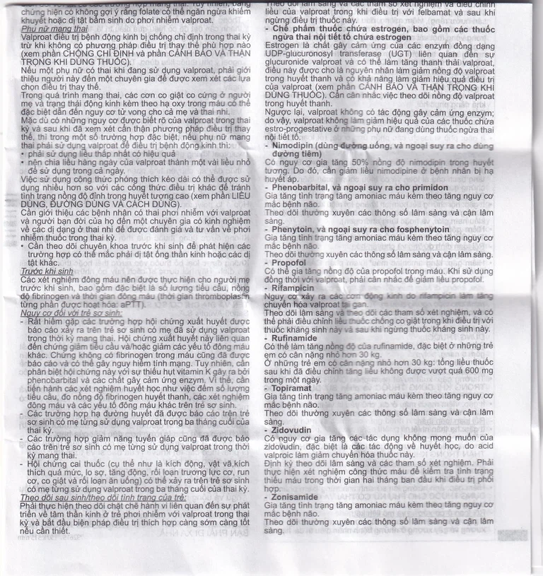 Dữ liệu hiện có cho thấy việc phơi nhiễm với valproat có thể dẫn tới tác dụng bất lợi lên sự phát triển tâm thần và thể chất của trẻ bị phơi nhiễm. Nguy cơ này phụ thuộc vào liều dùng nhưng mức liều thấp hơn ngưỡng vẫn không loại trừ được nguy cơ. Khoảng thời gian chính xác trong thai kỳ bị ảnh hưởng bởi nguy cơ này vẫn chưa được xác định và khả năng nguy cơ xảy ra trong suốt thai kỳ là không thể loại trừ.
