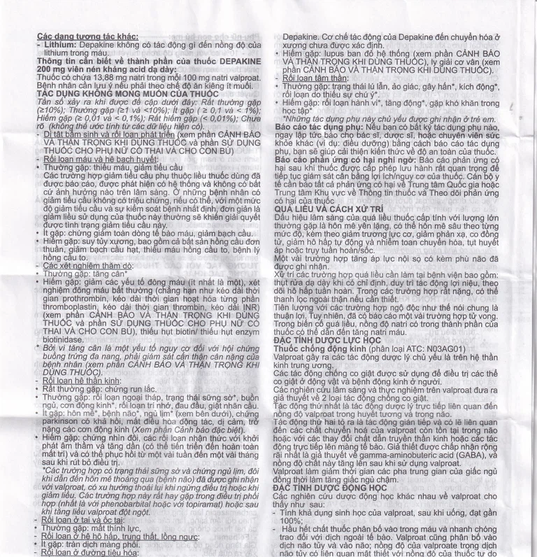Ít gặp: Giảm mật độ khoáng của xương, giảm xương, loãng xương và gãy xương ở những bệnh nhân điều trị dài hạn với Depakine 200mg cơ chế mà Depakine 200mg ảnh hưởng đến sự chuyển hóa xương chưa được xác định.