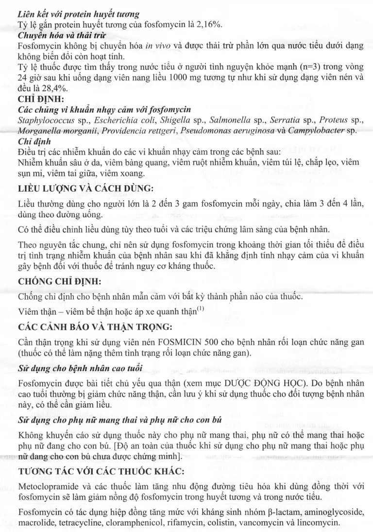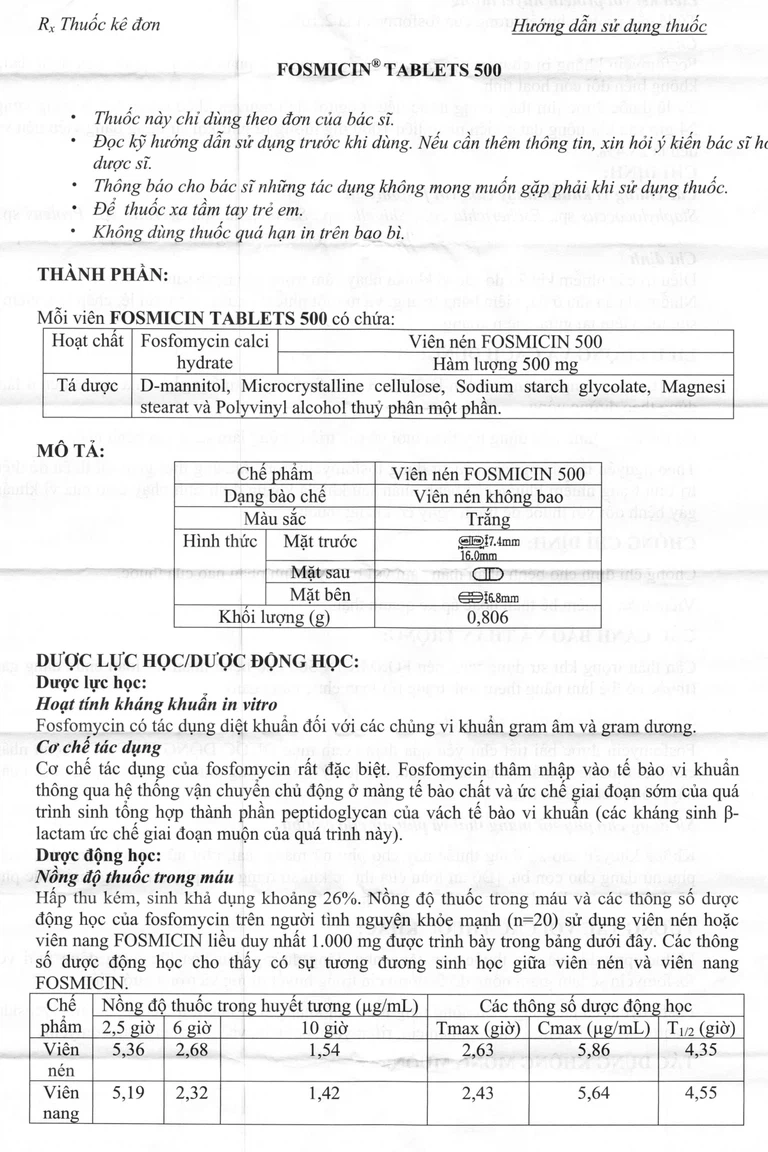 Fosmicin là dược phẩm của Công ty Dược phẩm Meiji Seika Pharma – Japan. Thuốc có thành phần chính là Fosfomycin calci hydrate. Đây là thuốc được dùng để điều trị các nhiễm khuẩn do vi khuẩn nhạy cảm trong các bệnh sau: Nhiễm khuẩn sâu ở da, viêm bàng quang, viêm ruột nhiễm khuẩn, viêm túi lệ, chắp lẹo, viêm sụn mi, viêm tai giữa, viêm xoang.