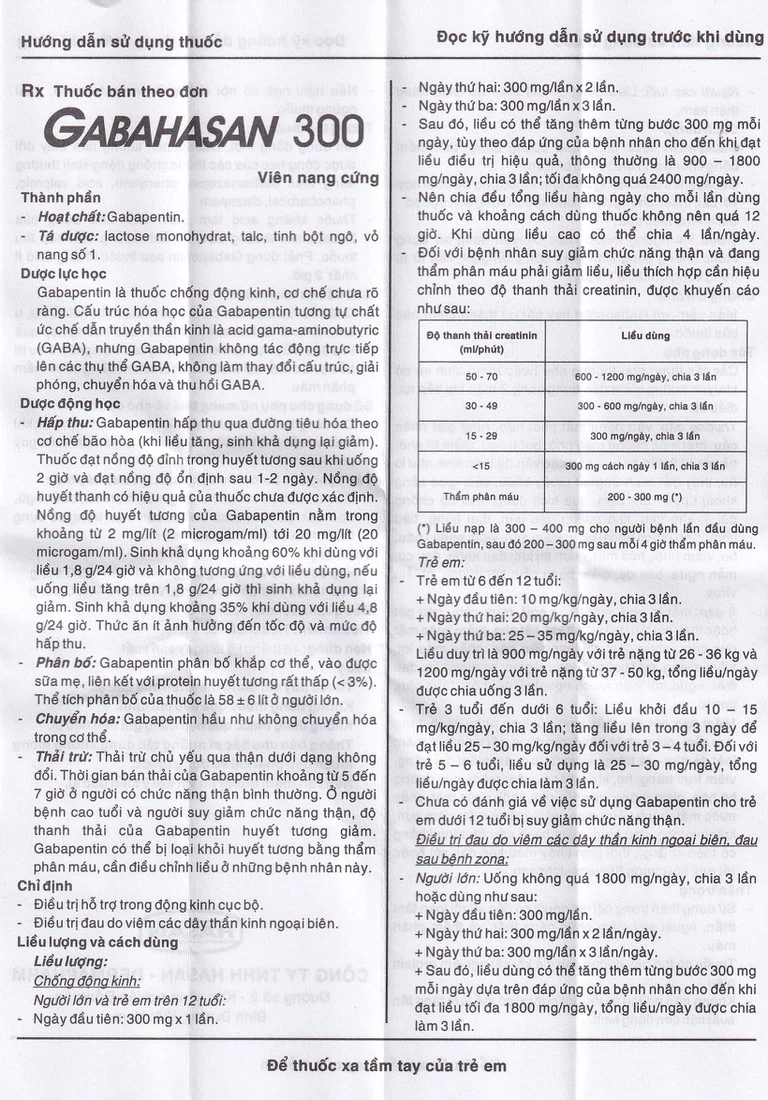 (*) Liều nạp là 300 – 400mg cho người bệnh lần đầu dùng Gabapentin, sau đó 200 – 300mg sau mỗi 4 giờ thẩm phân máu.