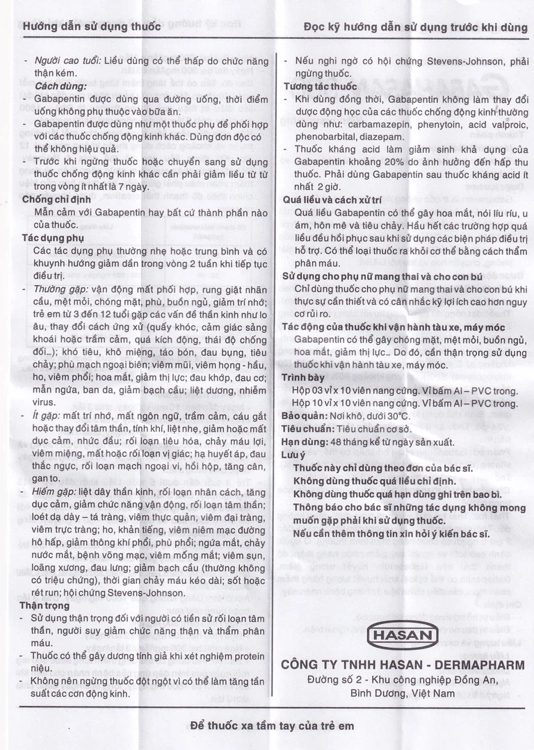 Gabapentin có thể gây chóng mặt, mệt mỏi, buồn ngủ, hoa mắt, giảm thị lực… Do đó, cần thận trọng sử dụng thuốc khi vận hành tàu xe, máy móc.