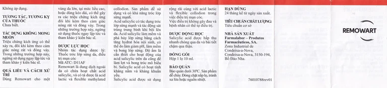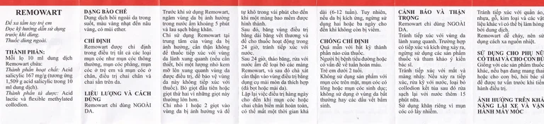 Dung dịch bôi ngoài da Remowart là sản phẩm của Farmalabor có thành phần chính là Acid salicylic. Remowart được chỉ định trong điều trị tất cả các loại mụn cóc như mụn cóc thông thường, mụn cóc phẳng, mụn cóc ở trẻ em và mụn cóc ở chân, điều trị chai chân và chai sần trên da.