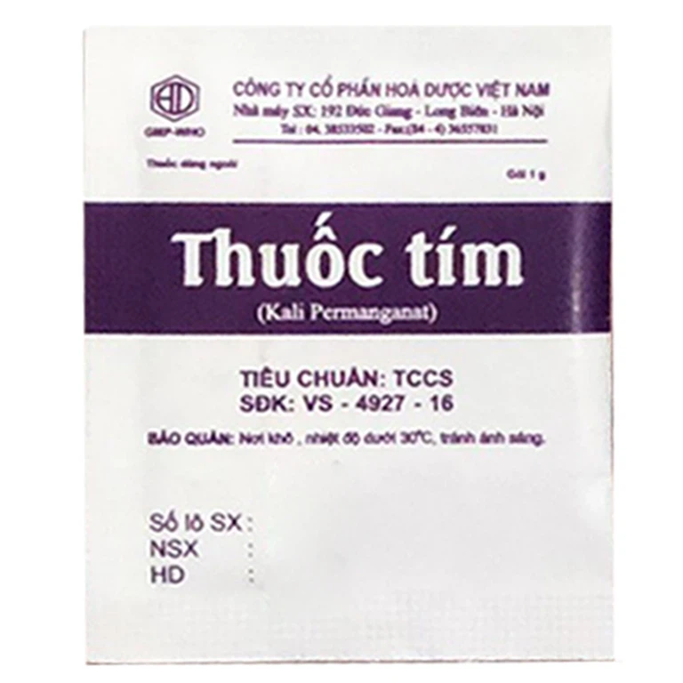 Thuốc tím của Công ty Cổ phần Hóa Dược Việt Nam, thành phần chính là kali permanganat. Thuốc có tác dụng làm sạch vết thương, vết loét, chàm cấp tính đặc biệt nơi có nhiễm trùng thứ cấp.