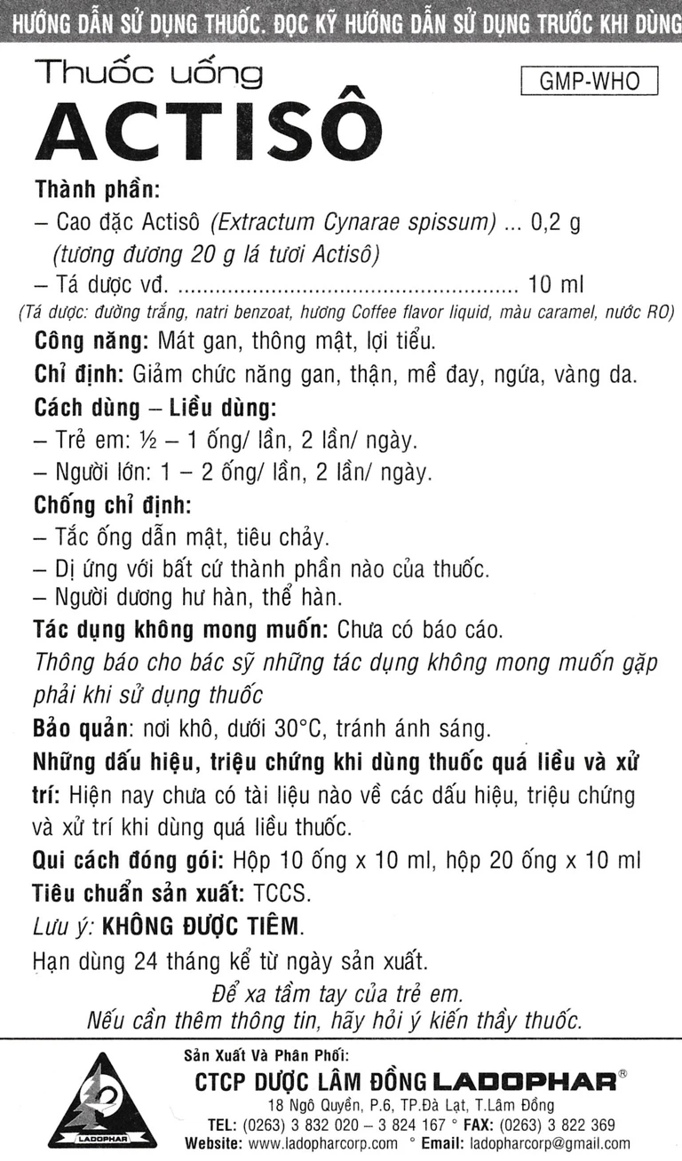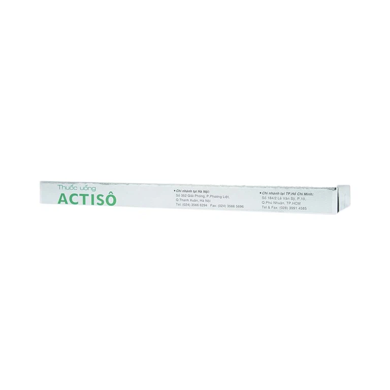 Thuốc uống Actiso được sản xuất bởi Công ty Cổ phần Dược phẩm Lâm Đồng, có thành phần chính là cao đặc actisô. Thuốc uống Actiso giúp mát gan, lợi mật và hỗ trợ tăng cường chức năng gan, đồng thời cải thiện quá trình tiêu hóa do chức năng gan kém. Thuốc uống Actiso được bào chế dưới dạng dung dịch uống, hộp 10 ống x ống 10 ml.