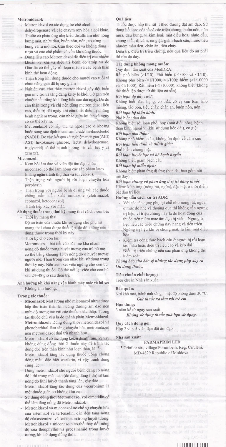 - Miconazol: Một lượng nhỏ miconazol nitrat được hấp thu toàn thân khi dùng đường âm đạo nên mức độ tương tác với các thuốc khác thấp. Tương tác thuốc chủ yếu do thành phần Metronidazol.