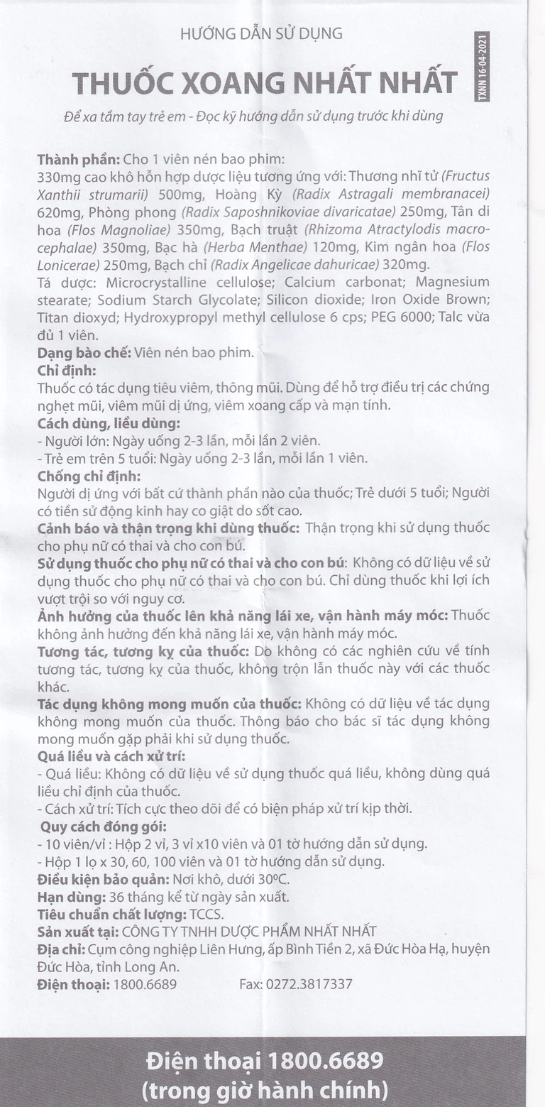 Thuốc xoang Nhất Nhất có thành phần chính từ cao khô hỗn hợp dược liệu, sản xuất bởi Công ty TNHH Dược phẩm Nhất Nhất. Thuốc xoang Nhất Nhất hiệu quả trong hỗ trợ điều trị các chứng nghẹt mũi, viêm mũi dị ứng, viêm xoang cấp và mạn tính.