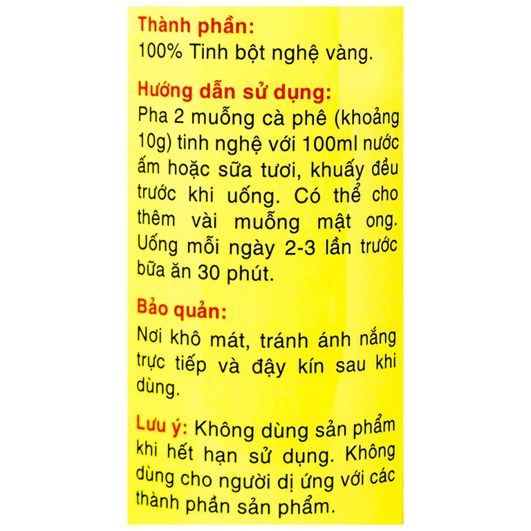Pha 2 muỗng cà phê (10g) tinh nghệ với 100ml nước ấm hoặc sữa tươi, khuấy đều trước khi uống.