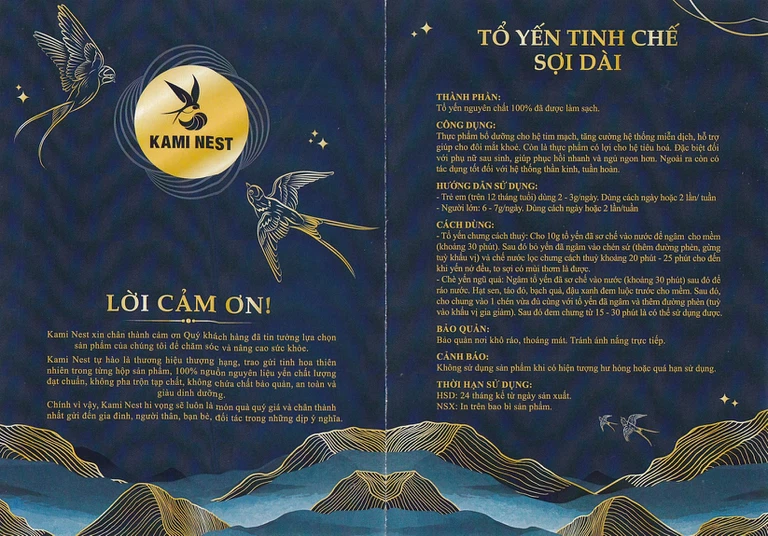 Tổ yến tinh chế sợi dài Kami Nest là sản phẩm thuộc thương hiệu Kami Nest của Công ty TNHH Yến sào thiên nhiên Danh Yến. Kami Nest tự hào là thương hiệu thượng hạng, trao gửi tinh hoa thiên nhiên trong từng hộp sản phẩm, 100% nguồn nguyên liệu yến chất lượng đạt chuẩn, không pha trộn tạp chất, không chứa chất bảo quản, an toàn và giàu dinh dưỡng.