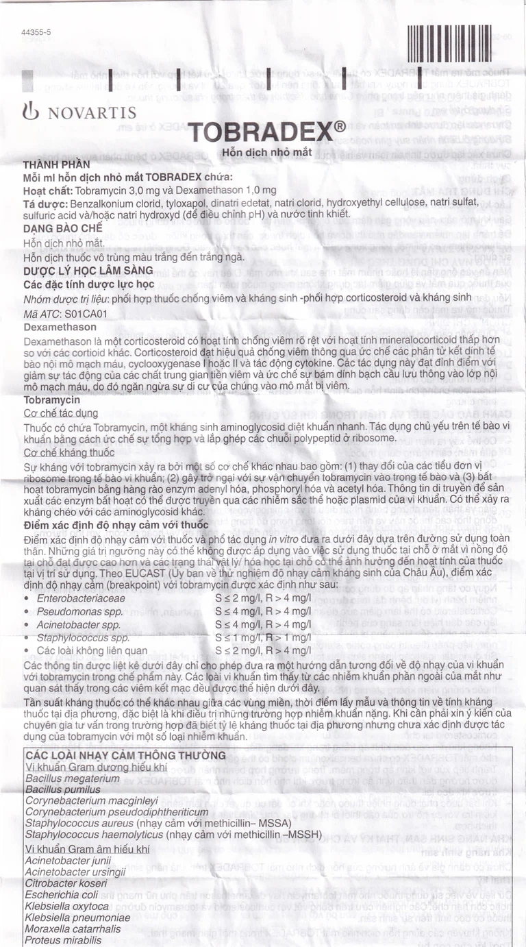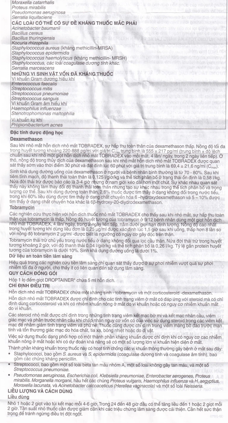 Các nghiên cứu thực hiện với hỗn dịch thuốc nhỏ mắt TOBRADEX cho thấy sau khi nhỏ mắt, sự hấp thu toàn thân của tobramycin là thấp. Nồng độ huyết tương của tobramycin ở 9/12 bệnh nhân dùng một giọt hỗn dịch nhỏ mắt TOBRADEX, 4 lần/ ngày, trong 2 ngày liên tiếp, nằm dưới giới hạn định lượng.