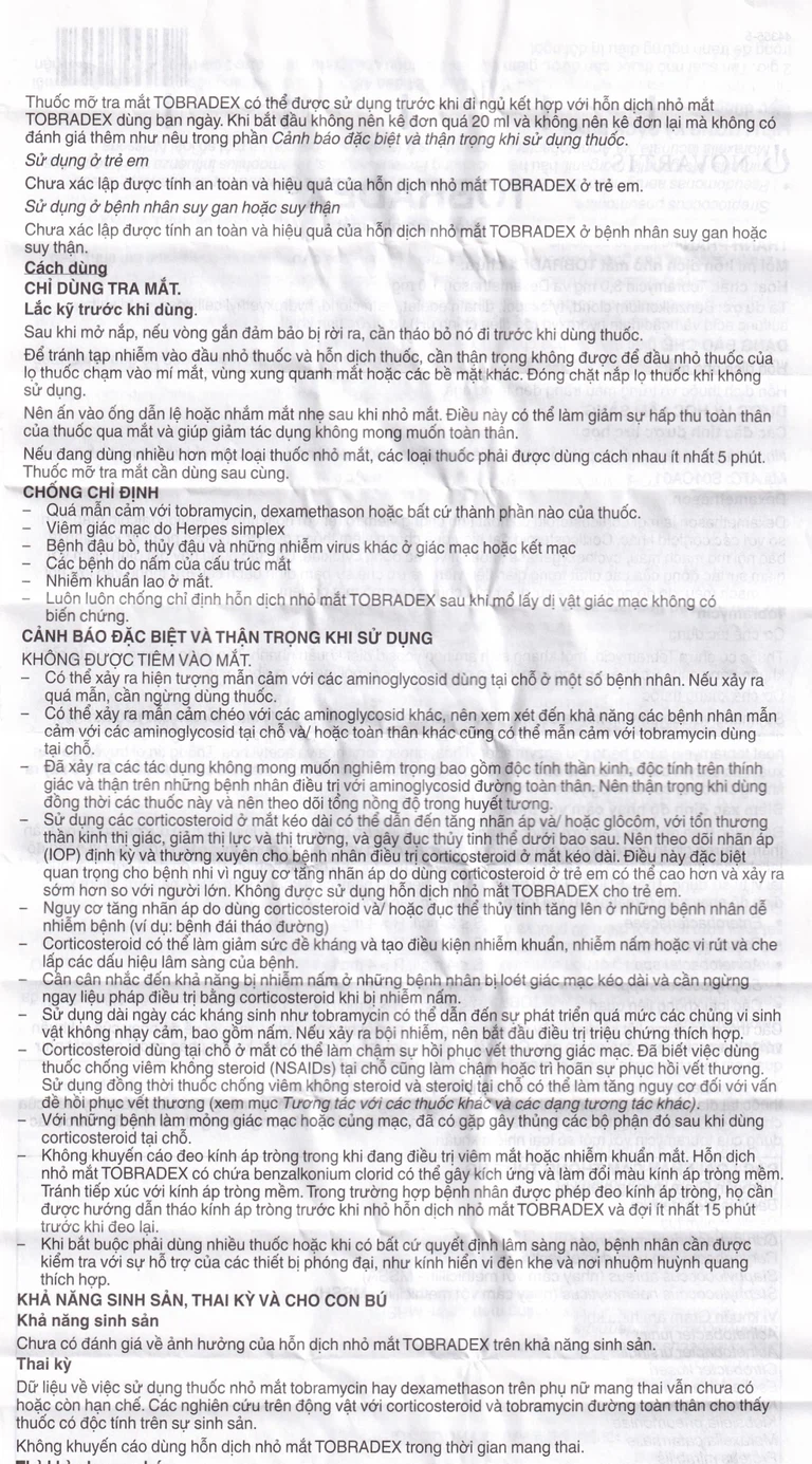 Không khuyến cáo đeo kính áp tròng trong khi đang điều trị viêm mắt hoặc nhiễm khuẩn mắt. Hỗn dịch nhỏ mắt TOBRADEX có chứa benzalkonium clorid có thể gây kích ứng và làm đổi màu kính áp tròng mềm. Tránh tiếp xúc với kính áp tròng mềm. Trong trường hợp bệnh nhân được phép đeo kính áp tròng, họ cần được hướng dẫn tháo kính áp tròng trước khi nhỏ hỗn dịch nhỏ mắt TOBRADEX và đợi ít nhất 15 phút trước khi đeo lại.