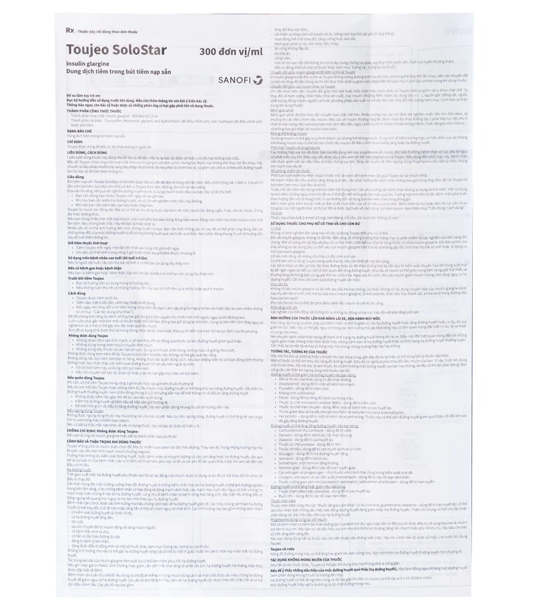 - Toujeo là insulin tác động dài. Có thể cho dùng thuốc này kèm với một insulin tác động ngắn, hoặc với các thuốc chống đái tháo đường khác.