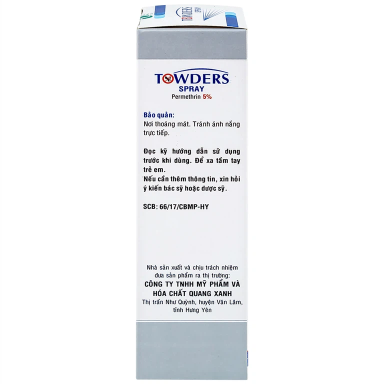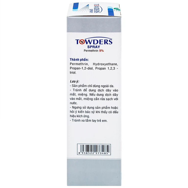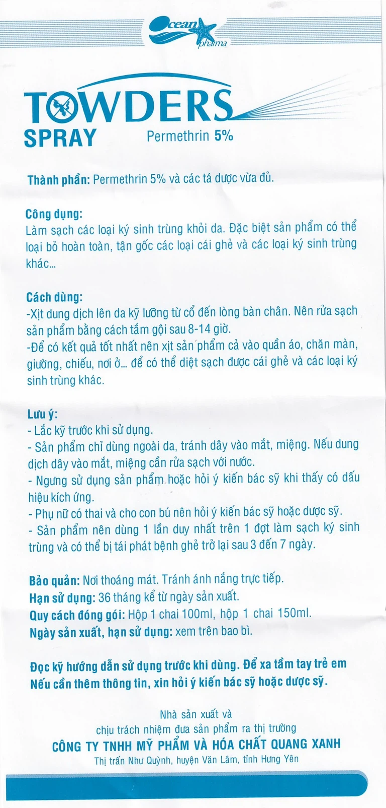 Towders Spray là loại thuốc dạng xịt đã được kiểm định và cho phép lưu hành rộng rãi trên toàn quốc bởi Bộ Y tế. Với mục đích trị các loại ký sinh trùng, ghẻ lở bong tróc trên da, Towders Spray được ra đời. Với hàm lượng 5% Permethrin chưa trong thành phần bên cạnh đó, sản phẩm còn một số thành phần tá dược cần thiết với số lượng phù hợp.