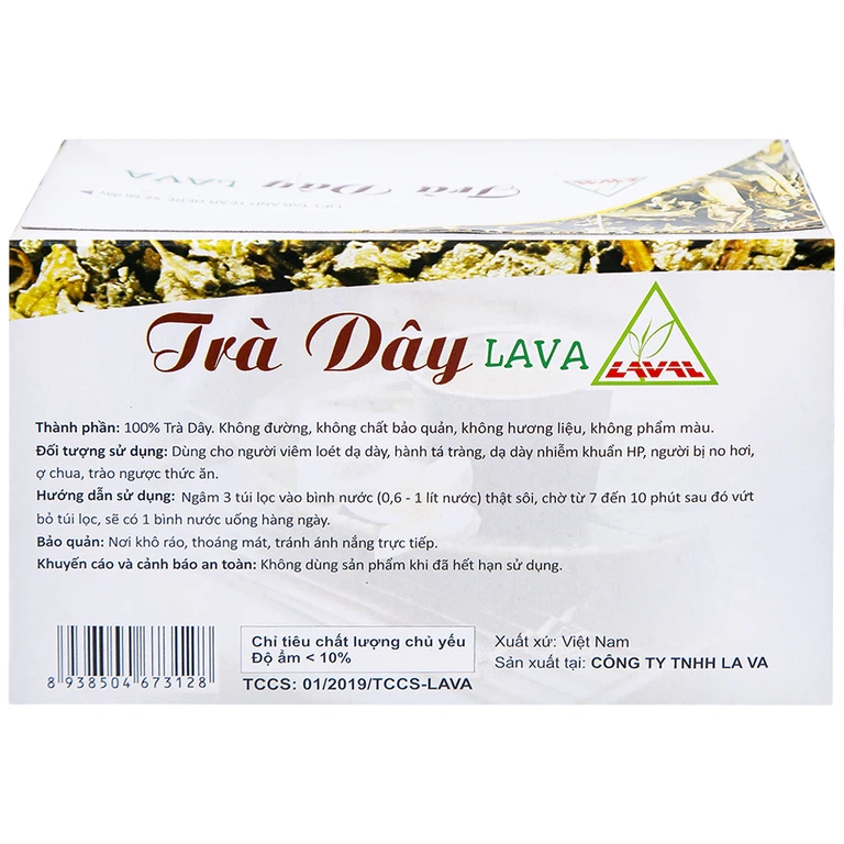 Trà Dây Lava là sản phẩm của Công ty TNHH Lava , chuyên sản xuất các sản phẩm chăm sóc sức khỏe nguồn gốc từ thảo dược 100% Việt Nam. Một số sản phẩm nổi bật của Lava là các thực phẩm chức năng, thực phẩm bổ sung vi chất dinh dưỡng và bảo vệ sức khỏe; các loại trà thảo dược dạng túi lọc, dạng cao và dạng lỏng,… giúp nâng cao sức khỏe cho người dùng. Lava cam kết sản phẩm luôn đạt tiêu chuẩn đã công bố, không sử dụng hoá chất, phụ gia, phẩm màu, bảo đảm sức khỏe cho người sử dụng.