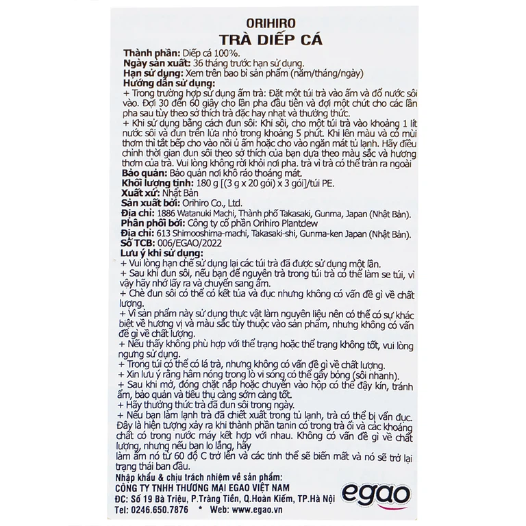 Trà diếp cá Orihiro túi lọc có thành phần là 100% diếp cá giàu chất xơ và khoáng chất. Sản phẩm được nghiên cứu và sản xuất tại Nhật Bản.