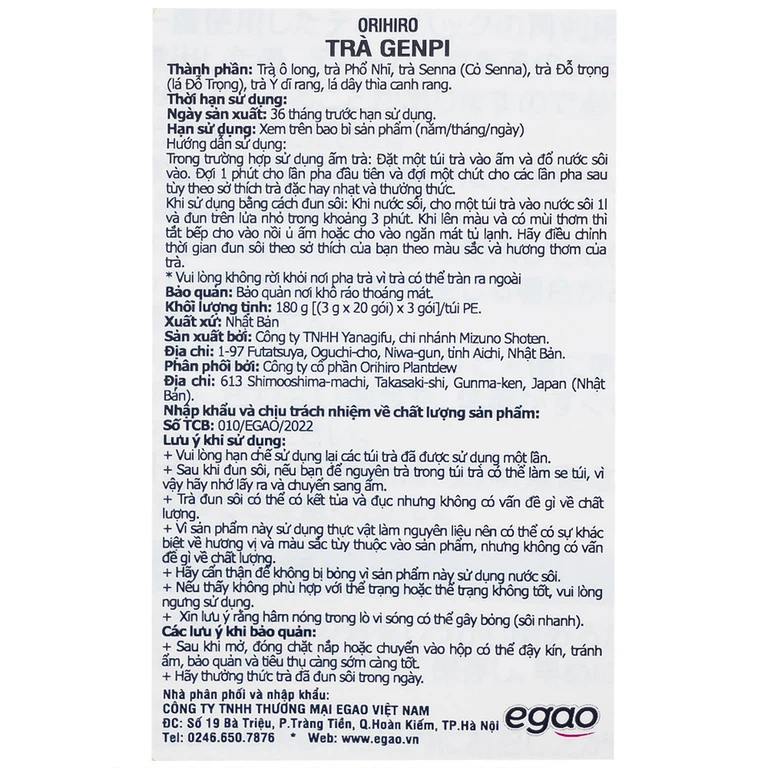 Trà Genpi Orihiro túi lọc có chứa trà ô long, trà Phổ Nhĩ, trà Senna, trà đỗ trọng, trà ý dĩ rang và lá dây thìa canh rang. Sản phẩm được nghiên cứu và sản xuất tại Nhật Bản.