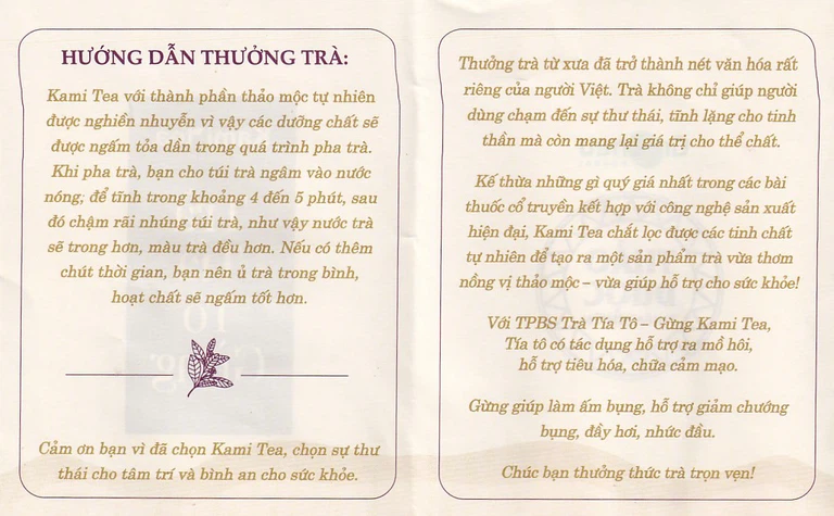 Trà Tía Tô – Gừng Kami tea với những thành phần dược liệu quen thuộc nhưng không kém phần hiệu quả như tía tô, gừng, cỏ ngọt, cam thảo, giúp hỗ trợ tiêu hóa, giảm đầy bụng, khó tiêu ; chữa cảm mạo, nhức đầu, hỗ trợ ra mồ hôi. Chỉ với một ly trà thảo dược, triệu chứng khó chịu của bạn sẽ bị đẩy lùi nhanh chóng.