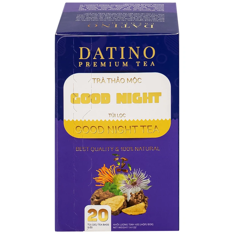 Trà thảo mộc Good Night Datino Premium Tea chứa thành phần là các thảo mộc thiên nhiên như bình vôi, lạc tiên, nấm đông trùng hạ thảo, tâm sen, thảo quyết minh, cỏ ngọt. Sản phẩm được sản xuất trên dây chuyền hiện đại, giúp lưu giữ trọn vẹn những giá trị dinh dưỡng có trong các nguyên liệu.