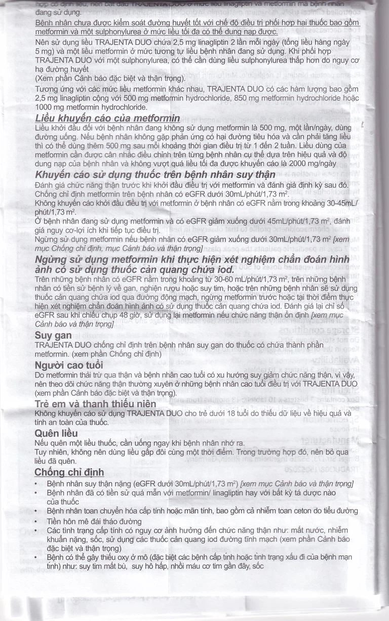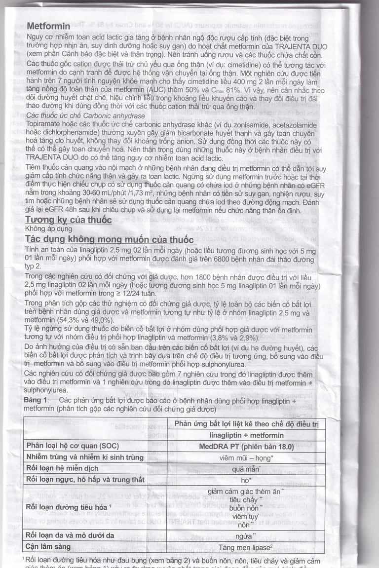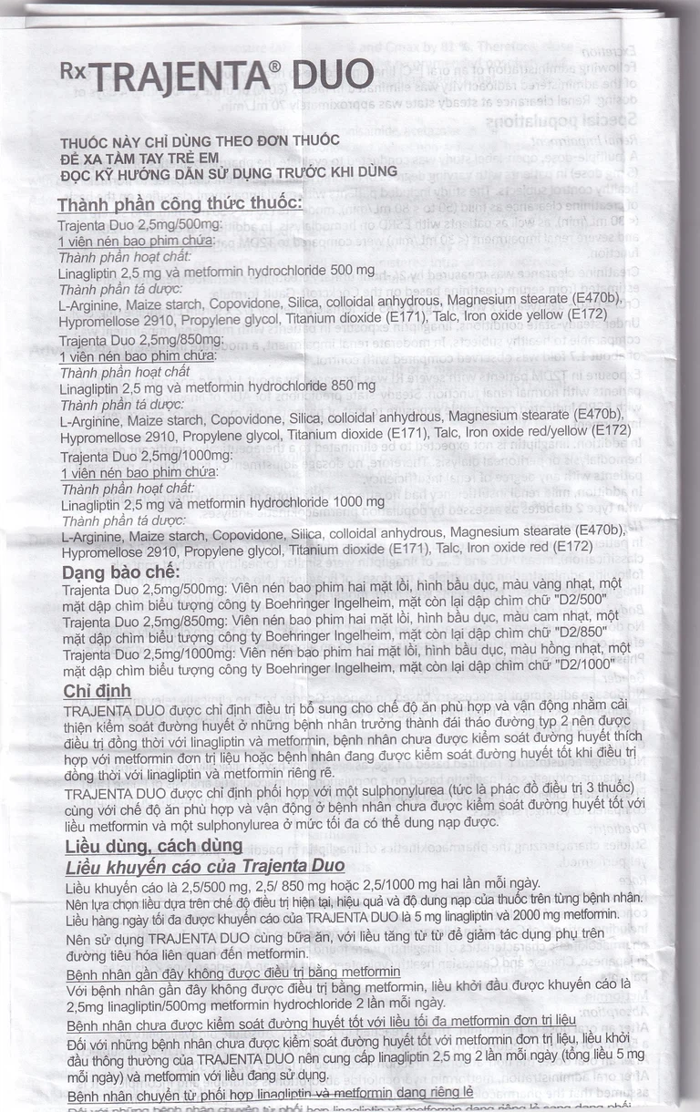 Thuốc Trajenta Duo 2.5mg/850mg là sản phẩm của Boehringer Ingelheim chứa hoạt chất Linagliptin và metformin hydrochloride. Đây là thuốc dùng điều trị bổ sung cho chế độ ăn phù hợp và vận động nhằm cải thiện kiểm soát đường huyết ở những bệnh nhân trưởng thành đái tháo đường type 2.