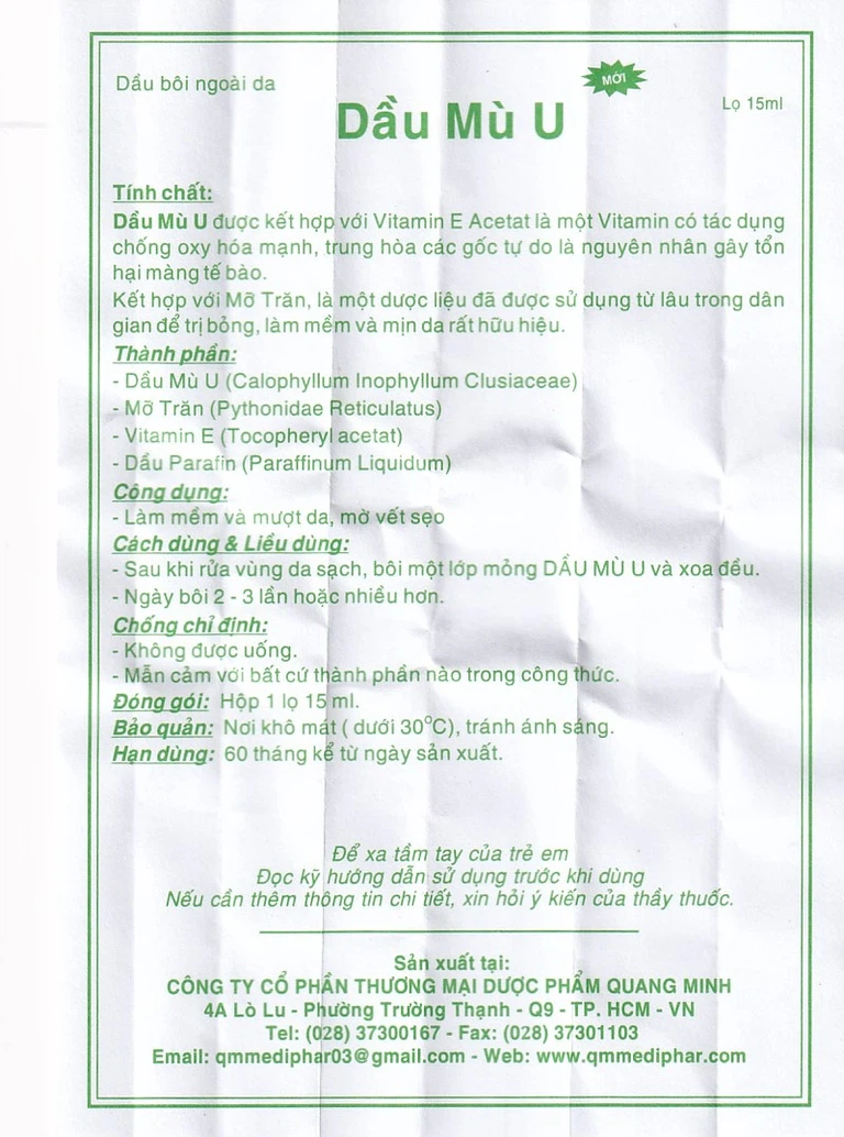 Dầu Mù U được sản xuất bởi Công ty Cổ phần ™ Dược phẩm Quang Minh. Với lịch sử hơn 40 năm hình thành, xây dựng và phát triển, đến nay Công ty CP Dược phẩm Quang Minh đã trở thành 1 thương hiệu uy tín được người tiêu dùng tín nhiệm. Nhà máy sản xuất thuốc của Công ty là nhà máy dược phẩm tư nhân đầu tiên tại Việt Nam đạt chứng nhận GMP. Tất cả các sản phẩm mang thương hiệu QM mediphar đều được Bộ Y Tế cho phép lưu hành và có mặt tại hầu hết các hiệu thuốc trên toàn quốc.