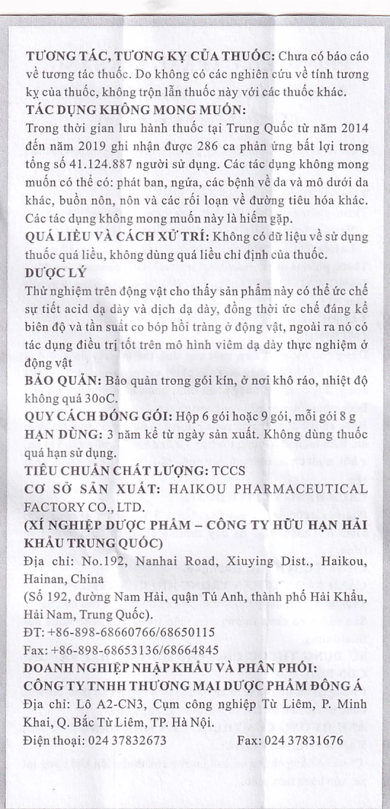 Pha với nước ấm, 1 gói (8g)/lần x 3 lần/ngày, Trường hợp viêm trợt niêm mạc dạ dày thường dùng 15 ngày một liệu trình.
