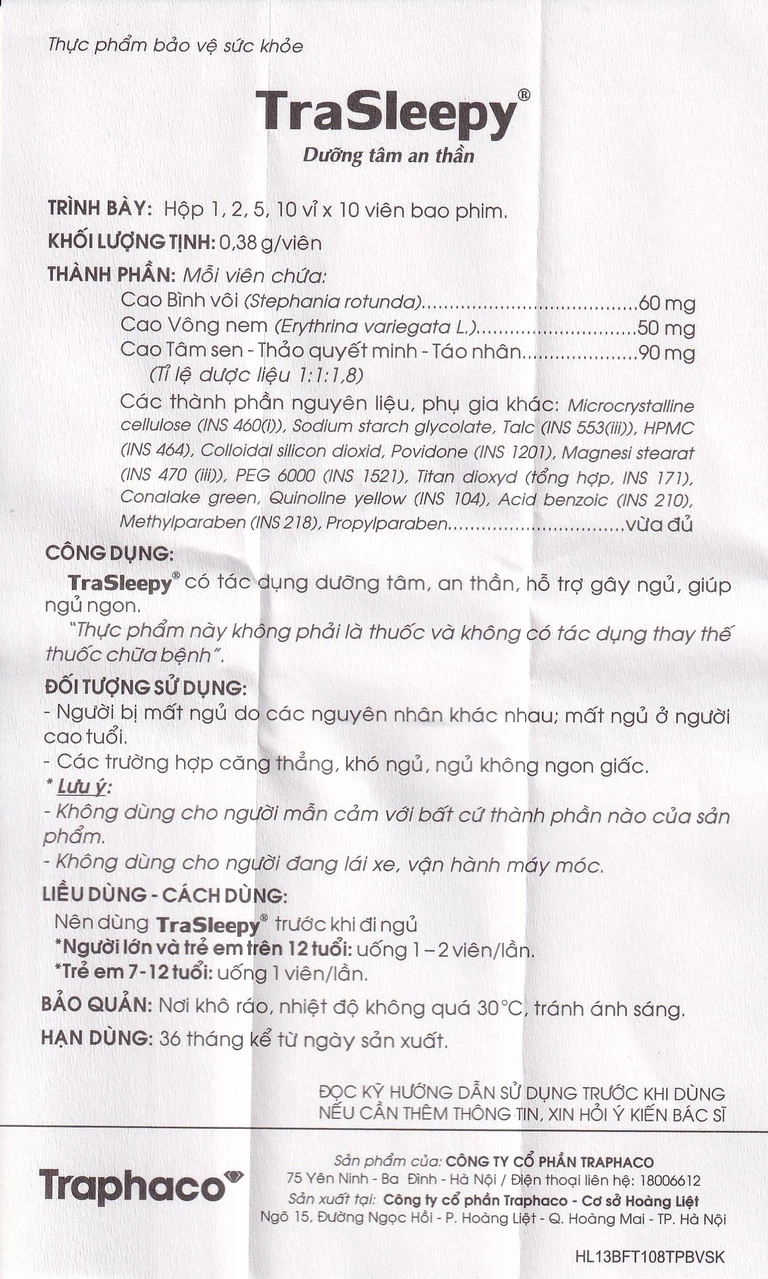 Các thành phần thảo dược có trong TraSleepy như: Táo nhân, lá vông, Rotundin có tính bình, vào tâm an, can, đởm có tác dụng dưỡng tâm an và bổ âm liễm hãn. Đặc biệt, táo nhân còn có tác dụng an thần, chữa chứng hồi hộp, bồn chồn do mất ngủ và thần kinh suy nhược. Từ đó, sản phẩm TraSleepy giúp an thần, giảm stress trong các trường hợp căng thẳng, suy nhược thần kinh.
