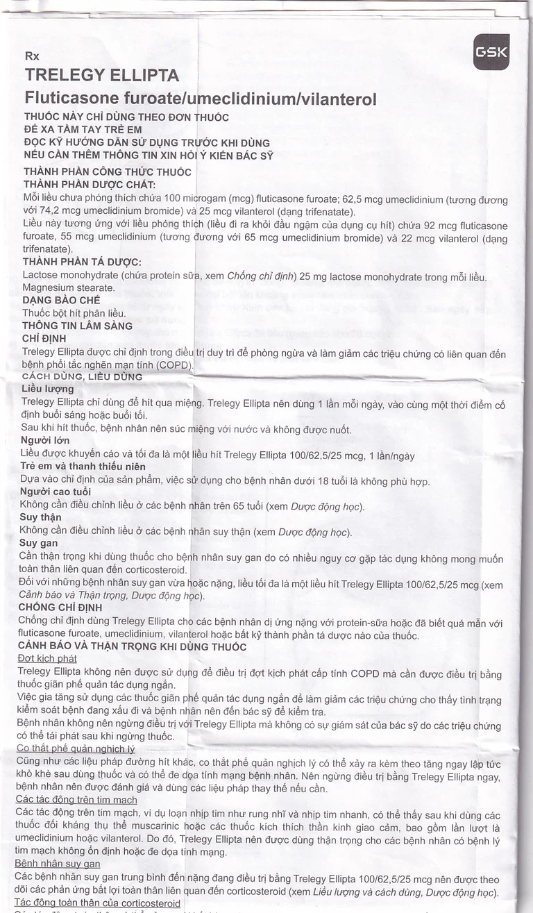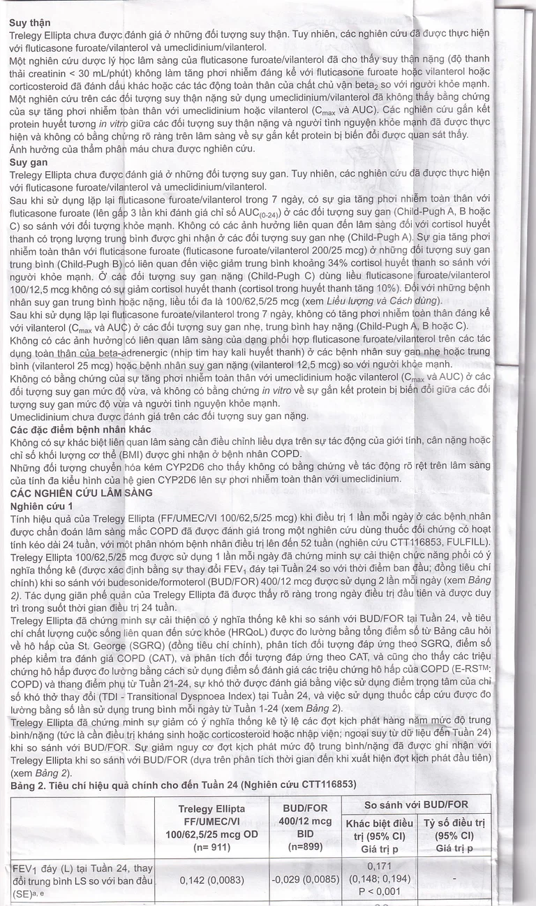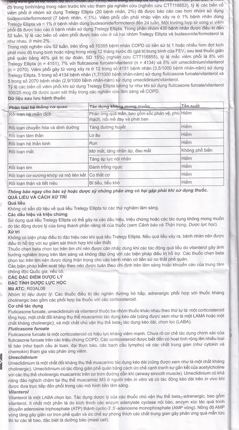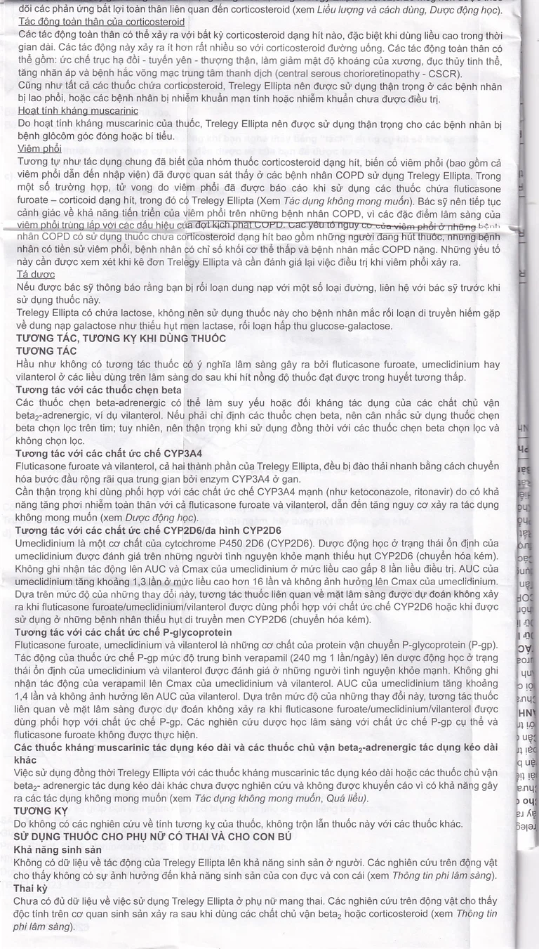 nhân có tiền sử viêm phổi, bệnh nhân có chỉ số khối cơ thể thấp và bệnh nhân mắc COPD nặng. Những yếu tố này cần được xem xét khi kê đơn Trelegy Ellipta và cần đánh giá lại việc điều trị khi viêm phổi xảy ra.