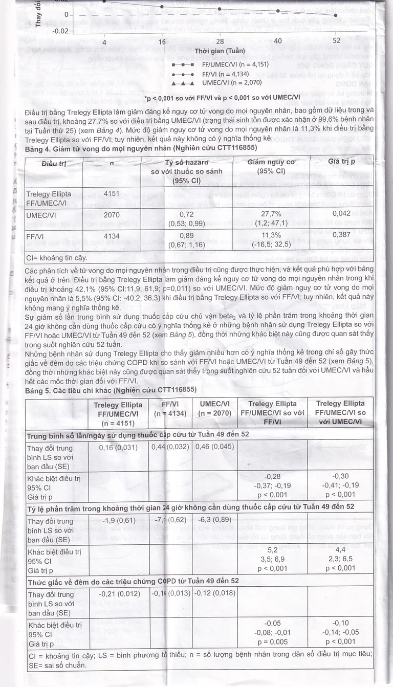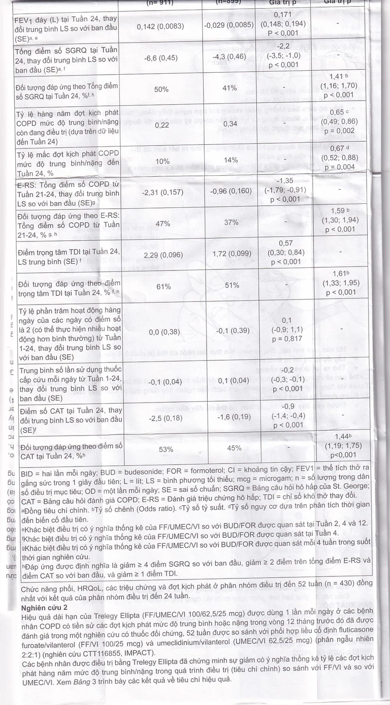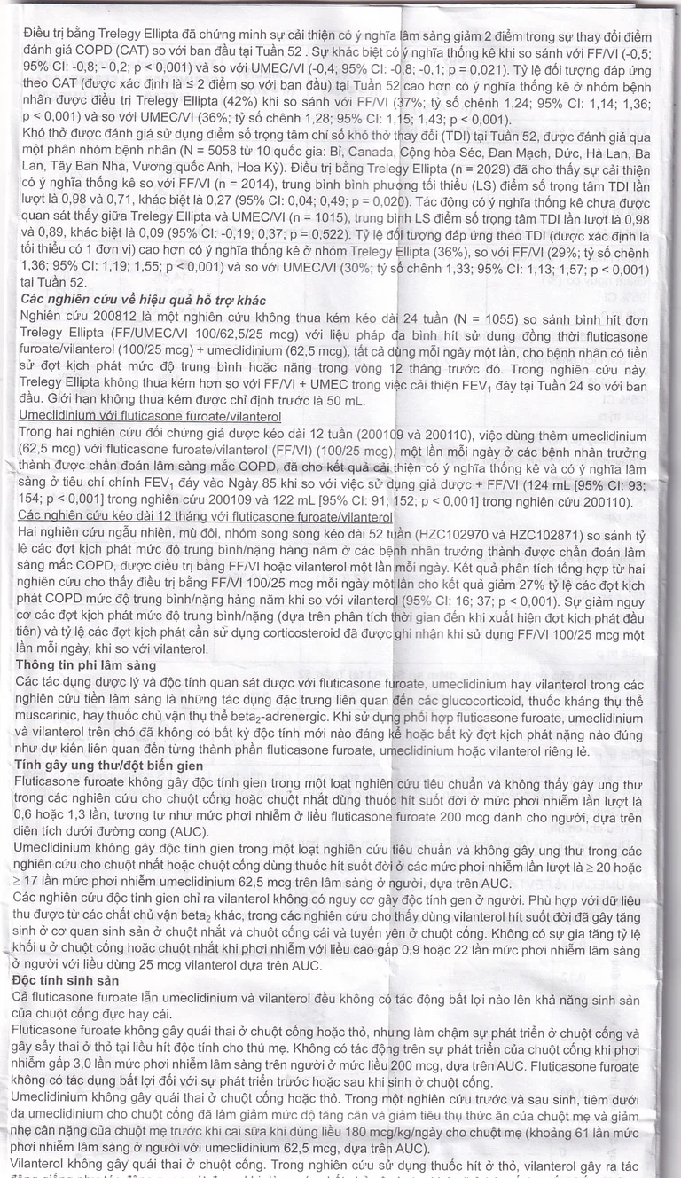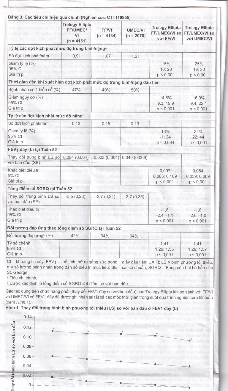 nhân có tiền sử viêm phổi, bệnh nhân có chỉ số khối cơ thể thấp và bệnh nhân mắc COPD nặng. Những yếu tố này cần được xem xét khi kê đơn Trelegy Ellipta và cần đánh giá lại việc điều trị khi viêm phổi xảy ra.