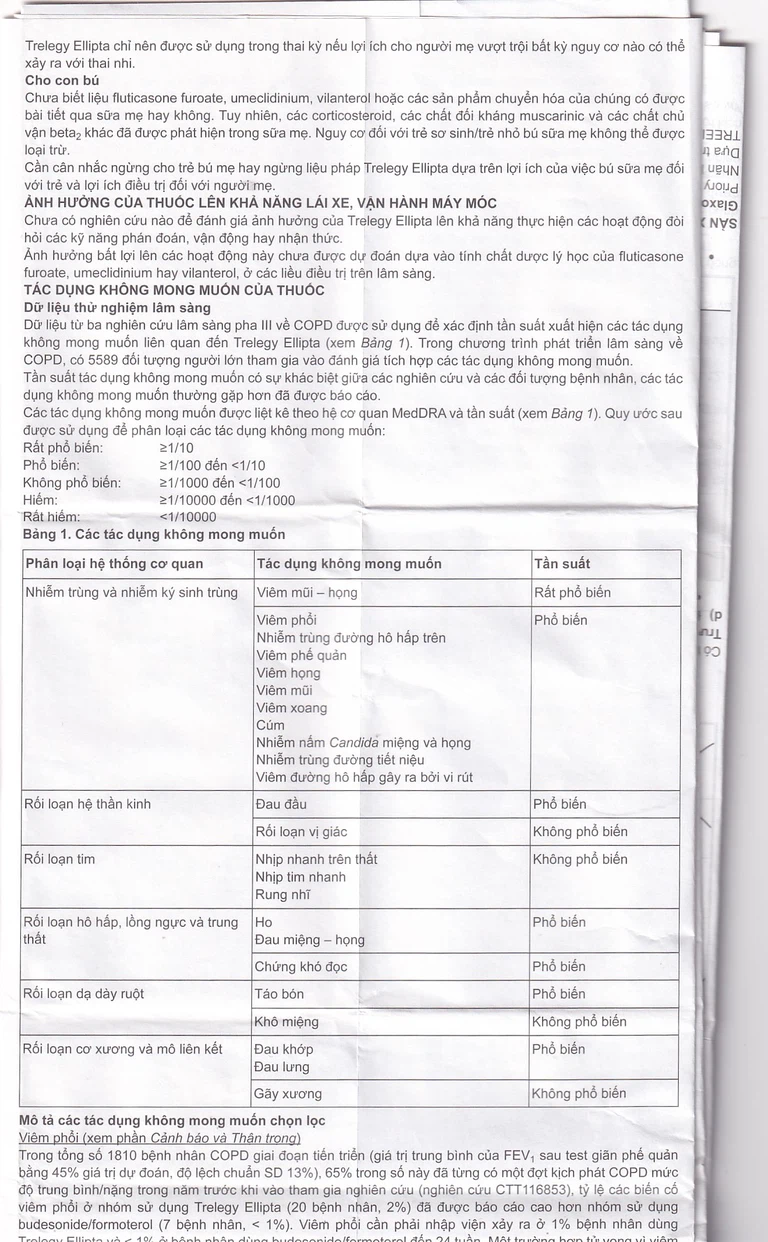 Tương tự như tác dụng chung đã biết của nhóm thuốc corticosteroid dạng hít, biến cố viêm phổi (bao gồm cả viêm phổi dẫn đến nhập viện) đã được quan sát thấy ở các bệnh nhân COPD sử dụng Trelegy Ellipta.