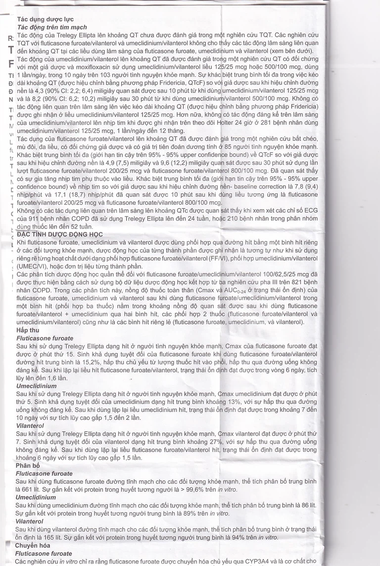 Không có các tác dụng liên quan trên lâm sàng lên khoảng QTc được quan sát thấy khi xem xét các chỉ số ECG của 911 bệnh nhân COPD đã sử dụng Trelegy Ellipta lên đến 24 tuần, hoặc 210 bệnh nhân trong phân nhóm dùng thuốc lên đến 52 tuần.