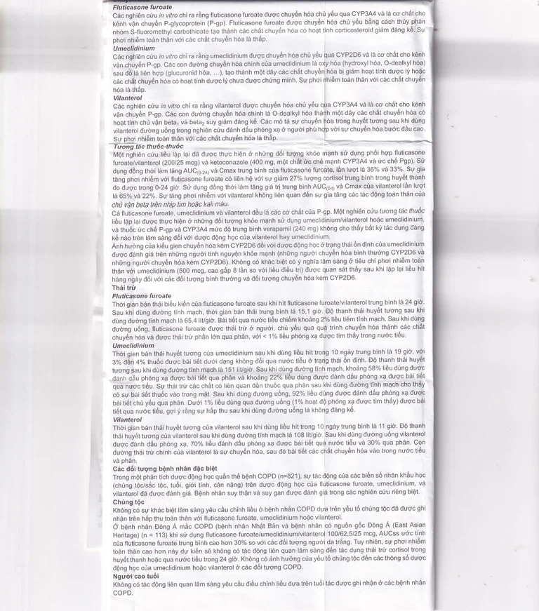 Các phân tích dược động học quần thể đối với fluticasone furoate/umeclidinium/vilanterol 100/62,5/25 mcg đã được thực hiện bằng cách sử dụng bộ dữ liệu dược động học kết hợp từ ba nghiên cứu pha III trên 821 bệnh nhân COPD. Trong các phân tích này, nồng độ thuốc toàn thân (Cmax và AUCy-24 ở trạng thái ổn định) của fluticasone furoate, umeclidinium và vilanterol sau khi dùng fluticasone furoate/umeclidinium/vilanterol trong một bình hít (phối hợp ba thuốc) nằm trong khoảng nồng độ quan sát được sau khi dùng fluticasone furoate/vilanterol + umeclidinium qua hai bình hít, các phối hợp 2 thuốc (fluticasone furoate/vilanterol và umeclidinium/vilanterol) cũng như là các bình hút riêng lẻ (fluticasone furoate, umeclidinium, và vilanterol).