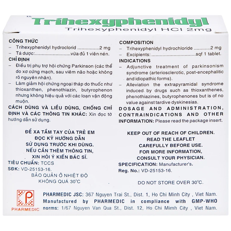 Trihexyphenidyl được hấp thu tốt qua đường tiêu hóa, tác dụng bắt đầu 1 giờ sau khi uống, nồng độ đỉnh xảy ra khoảng 2 – 3 giờ, kéo dài khoảng 6 – 12 giờ. Thuốc thải trừ chủ yếu qua thận dưới dạng không đổi và chất chuyển hóa. Thời gian bán thải 10,2 ± 4,7 giờ.