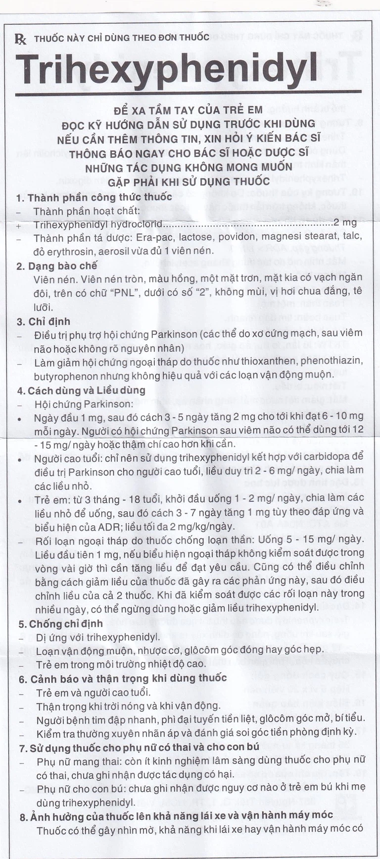 Uống 5 – 15 mg/ngày. Liều đầu tiên 1 mg, nếu biểu hiện ngoại tháp không kiểm soát được trong vòng vài giờ thì cần tăng liều để đạt yêu cầu. Cũng có thể điều chỉnh bằng cách giảm liều của thuốc đă gây ra các phản ứng này, sau đó điều chỉnh liều của cả 2 thuốc. Khi đã kiểm soát được các rối loạn này trong nhiều ngày, có thể ngừng dùng hoặc giảm liều trihexyphenidyl.