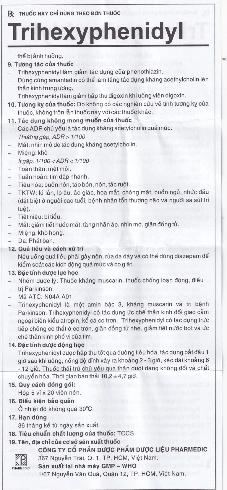 Trihexyphenidyl là một amin bậc 3, kháng muscarin và trị bệnh Parkinson. Trihexyphenidyl có tác dụng ức chế thần kinh đối giao cảm ngoại biên kiểu atropin, kể cả cơ trơn. Trihexyphenidyl có tác dụng trực tiếp chống co thắt ở cơ trơn, giãn đồng tử nhẹ, giảm tiết nước bọt và ức chế thần kinh phế vị của tim.
