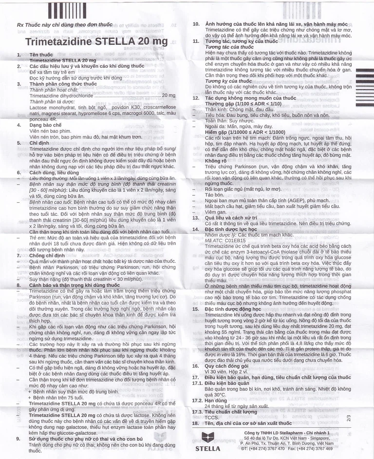 Trimetazidin Stella của công ty TNHH LD Stellapharm, thành phần Trimetazidine hydroclorid. Thuốc được chỉ định cho người lớn như liệu pháp bổ sung hỗ trợ vào biện pháp trị liệu hiện có để điều trị triệu chứng ở bệnh nhân đau thắt ngực ổn định không được kiểm soát đầy đủ hoặc bệnh nhân không dung nạp với các liệu pháp điều trị đau thắt ngực khác.