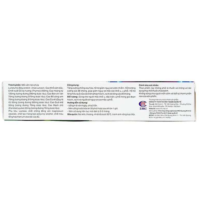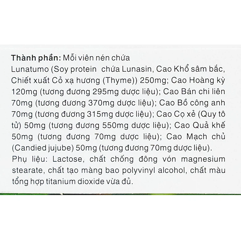 - Lunatumo (Soy protein chứa Lunasin, Cao Khổ sâm bắc, chiết xuất Cỏ xạ hương (Thyme): 250mg