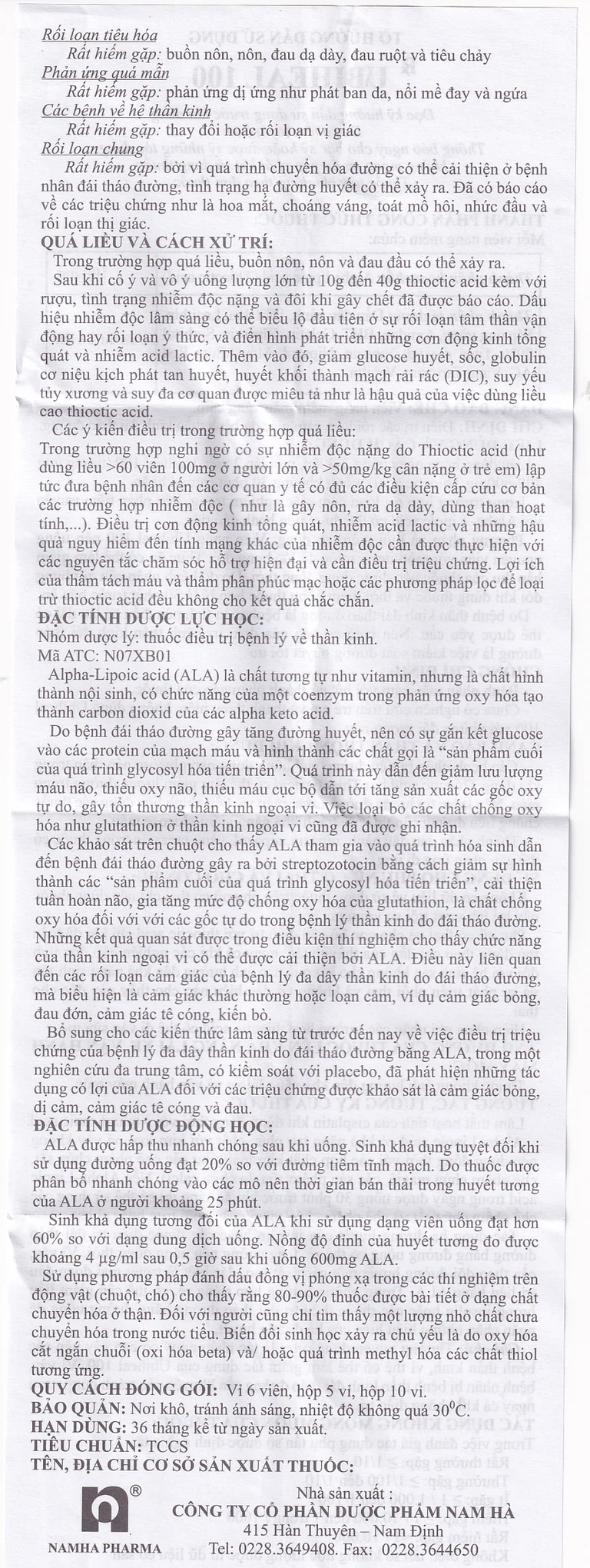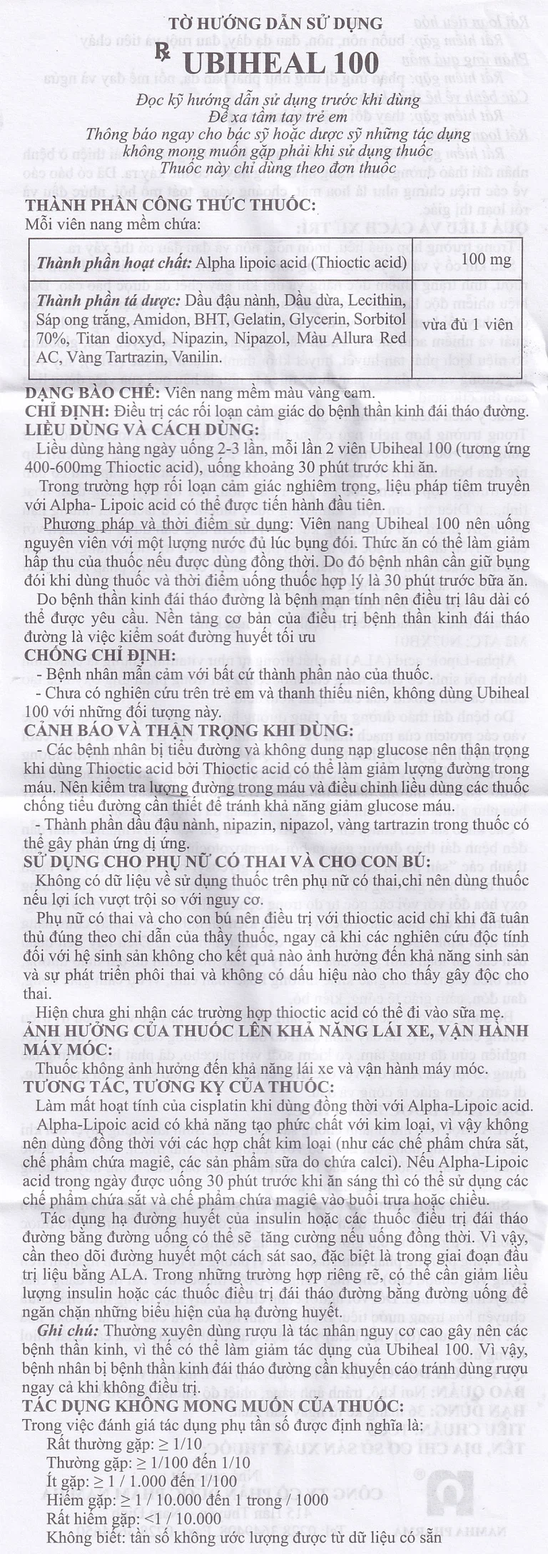 Thuốc Ubiheal 100 là sản phẩm của Công ty Cổ phần Dược phẩn Nam Hà chứa alpha lipoic acid dùng điều trị các rối loạn cảm giác do bệnh thần kinh đái tháo đường gây ra.