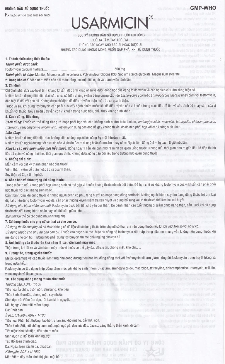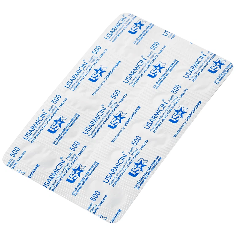Thuốc Usarmicin là sản phẩm của Usarichpharm chứa hoạt chất Fosfomycin calcium hydrate. Đây là thuốc điều trị nhiễm khuẩn đường tiết niệu dưới cấp chưa có biến chứng (viêm bàng quang cấp) do Escherechia coli hoặc Enterococcus faecalis nhạy cảm với fosfomycin, đặc biệt là đối với phụ nữ.