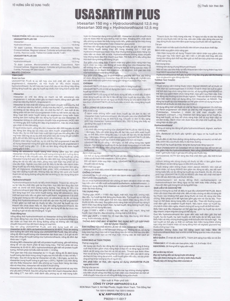 Ở bệnh nhân không kiểm soát được huyết áp với đơn trị liệu với irbesartan hoặc hydroclorothiazid, liều khuyến cáo của Usasartim Plus là 150/12,5 mg và 300/12,5 mg. Chuyển từ đơn trị liệu sang phối hợp irbesartan /hydroclorothiazid liều 150/12,5mg cho thấy sự gia tăng hiệu quả rõ rệt nhất.