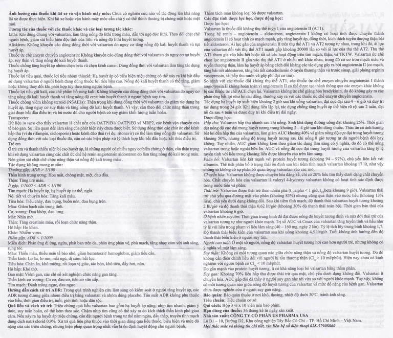 Tác dụng hạ huyết áp xuất hiện khoảng 2 giờ sau khi uống Valsartan, đạt cực đại sau 4 – 6 giờ và duy trì tác dụng trong 24 giờ. Khi dùng liều lặp lại, tác dụng chống tăng huyết áp thể hiện rõ rệt sau 2 tuần, đạt tối đa sau 4 tuần và được duy trì khi điều trị dài ngày.